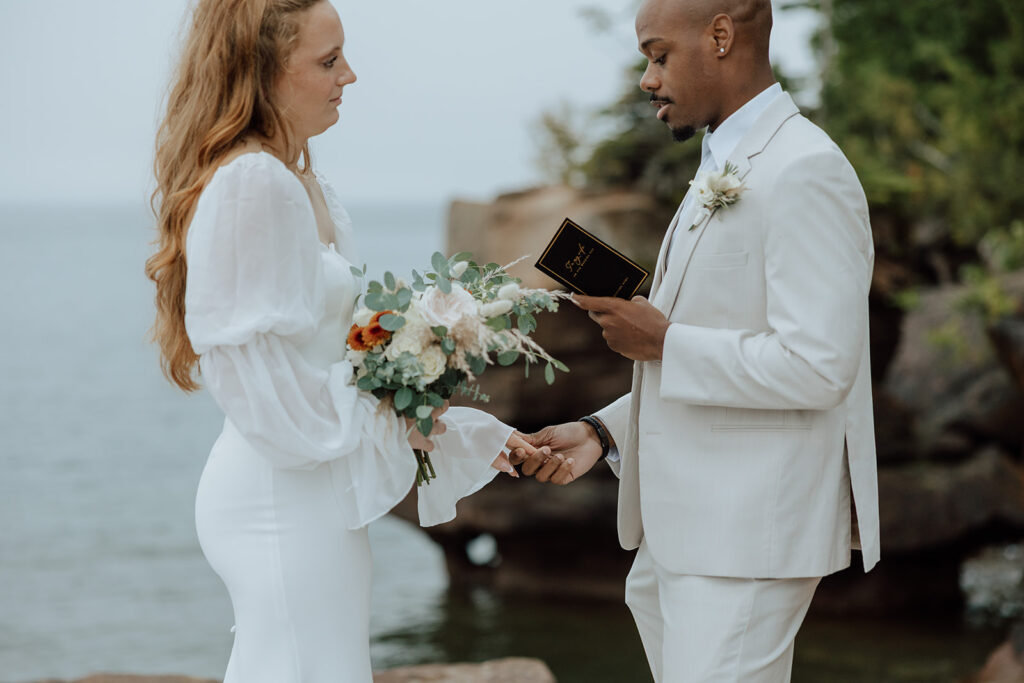 In the age of everything being digital, some things need to be physical. Not only will this look better in photos, but it also will keep you more in the moment without additional distractions. You will also be able to keep them forever vs having them as a note on your phone. You can start by writing them on your phone or computer, but I recommend getting a pair of vow books in advance to copy them down in.