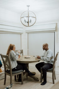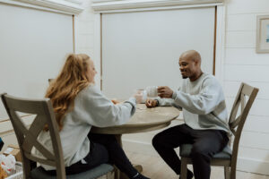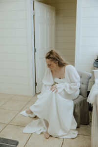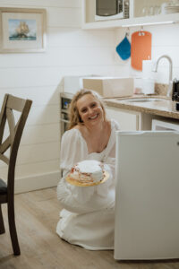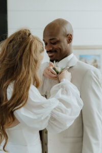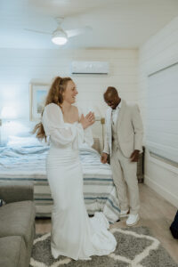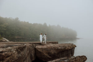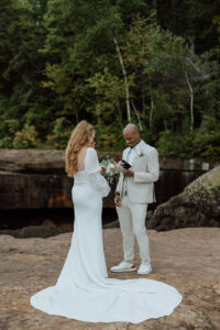 Jenna and Jarrod’s elopement on Madeline Island was such a memorable experience. They began their day by writing their vows together over coffee in the early morning, before the sun rose. Once they finished, they got ready separately and shared a laid back first look in the living room of their bungalow.