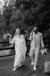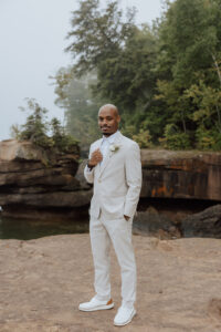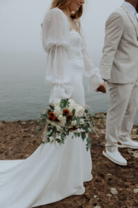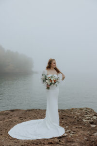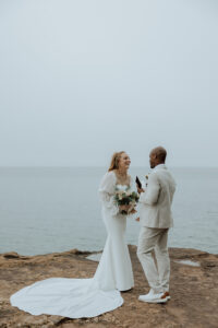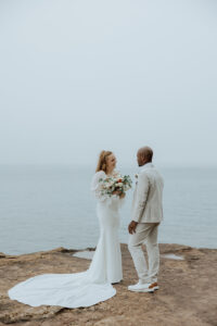 Since it was still a bit dark when we arrived, they had time to soak in the views and share a few quiet moments together before we began. It was a dark, foggy morning, and the sun stayed hidden behind the clouds. That fog created a moody, atmospheric setting that felt incredibly fitting for their vows and portraits. Jenna and Jarrod shared vows they had written themselves, both vulnerable, honest, and deeply romantic.