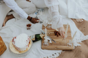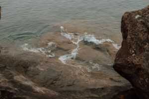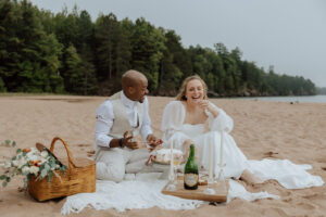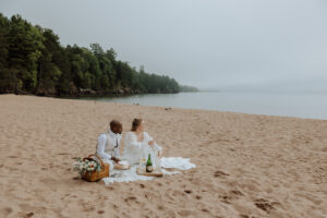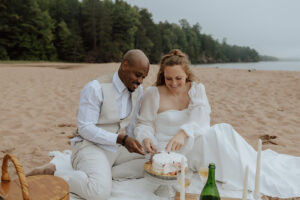 After their vows, we spent some time exploring the trail and stopping at a few overlooks for photos. Madeline Island truly has some of the most stunning views in the state. Once we wrapped up at the state park, we headed to another location where they enjoyed a beach picnic with champagne and a cake made by Jenna’s aunt, even though it got a little smooshed during transit. They took their time relaxing, enjoying the views of Lake Superior, and being fully present together.